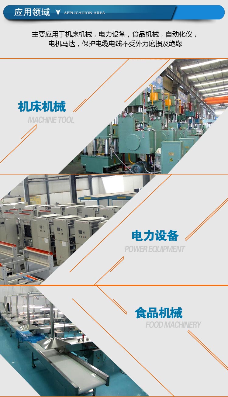 產品應用: 可用于機床機械,電力設備,食品機械,自動化儀, 電機馬達,保護電纜電線不受外力磨損及絕緣